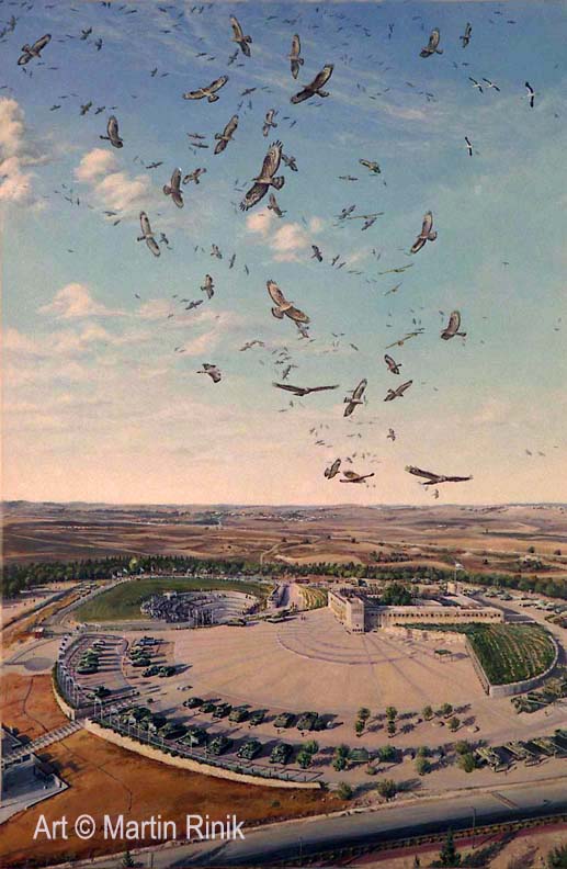 | About 900,000 Honey Buzzards migrate over Israel every spring and autumn. The flock in this painting is soaring above the Armoured Corps Memorial in the Ayalon Valley. Tanks in the front are a reminder of the Israeli war of independence. At the top of the hill is a radar station (green ball) operated by the International Center for the Study of Bird Migration (located behind trees) to determine the location of bird flocks. |
