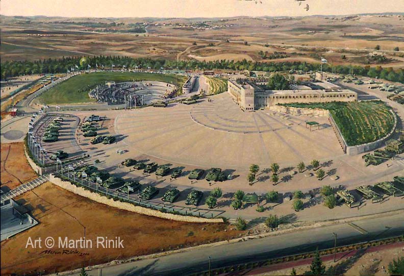 | About 900,000 Honey Buzzards migrate over Israel every spring and autumn. The flock in this painting is soaring above the Armoured Corps Memorial in the Ayalon Valley. Tanks in the front are a reminder of the Israeli war of independence. At the top of the hill is a radar station (green ball) operated by the International Center for the Study of Bird Migration (located behind trees) to determine the location of bird flocks. |