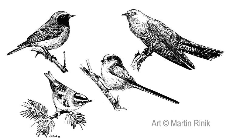 | from left above: European Redstart, European Cuckoo below and middle: Firecrest, Long-tailed Tit Line drawings © Martin Rinik Illustrations for the book Birds Distribution in Slovakia Scientific names of illustrated species: Phoenicurus phoenicurus, Cuculus canorus, Corvus corone, Aegithalos caudatus |